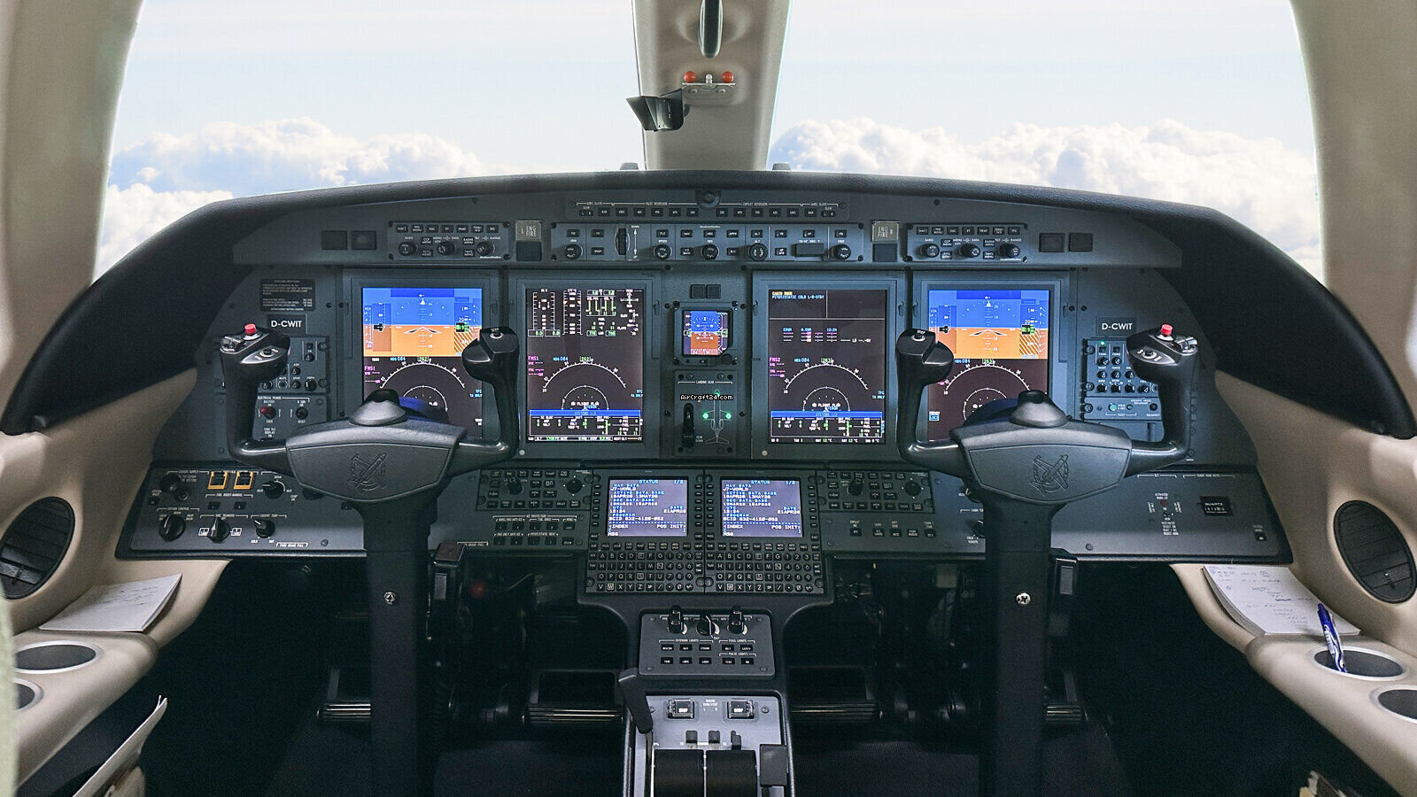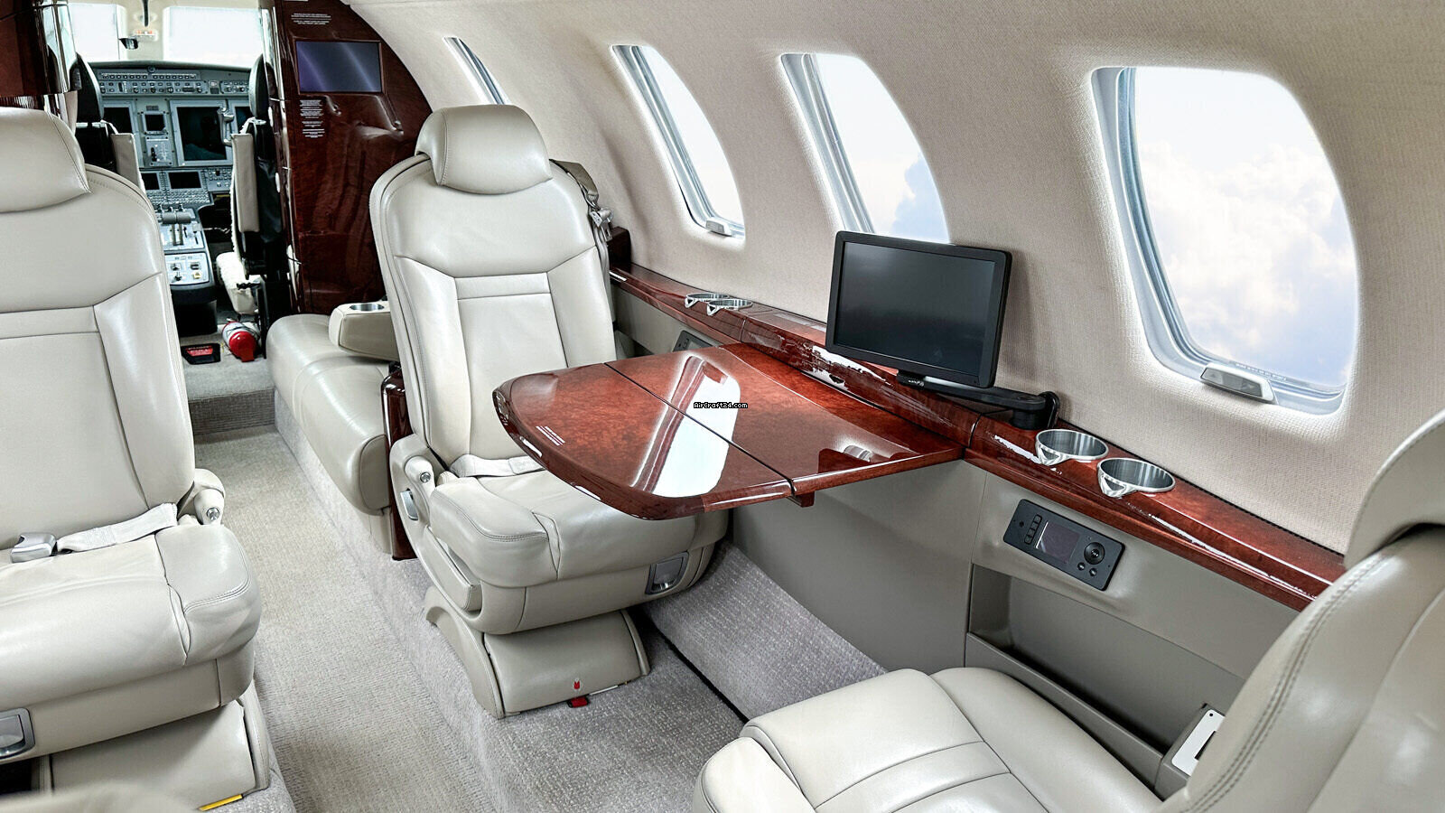 | Interior | | 2 Crew-, 4 Club Seats; 2 single fwd. Seats, double seat Divan (Couch) and belted Toilet Seat (max. 9 Pax), AC Power Outlets, Lavatory with sliding door for privacy, 2 additional foldable slimline Tables on seat 7 & 8, Satcom Telephone, Airshow with Media Center and 2 additional Table Screens, Hot Coffee Bar, electric Window shades. |